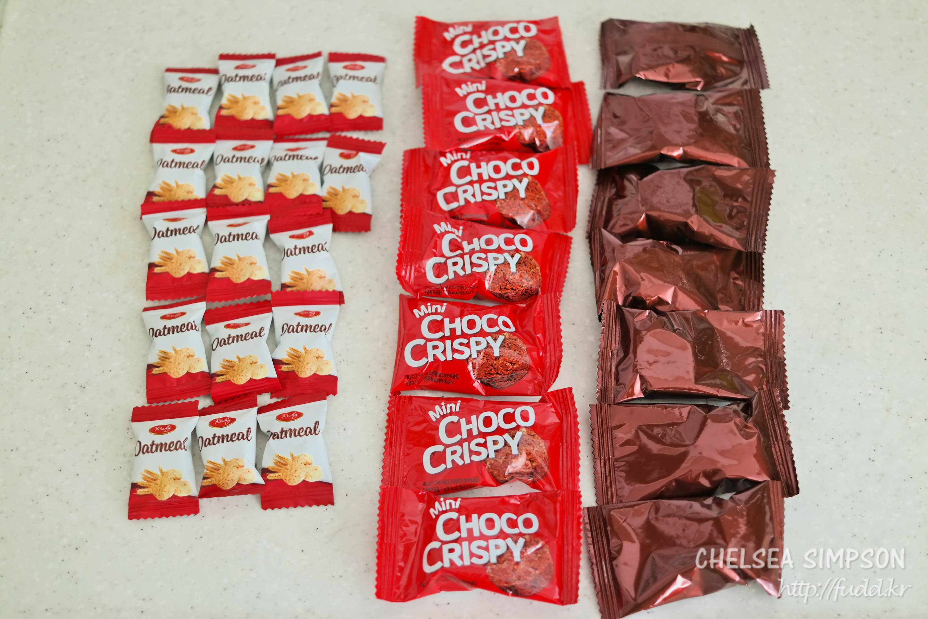 왼쪽부터 오트밀 미니바이트(17개), 니코 미니 초코 크리스피(7개), 니코 미니 다크초코 크리스피(7개).