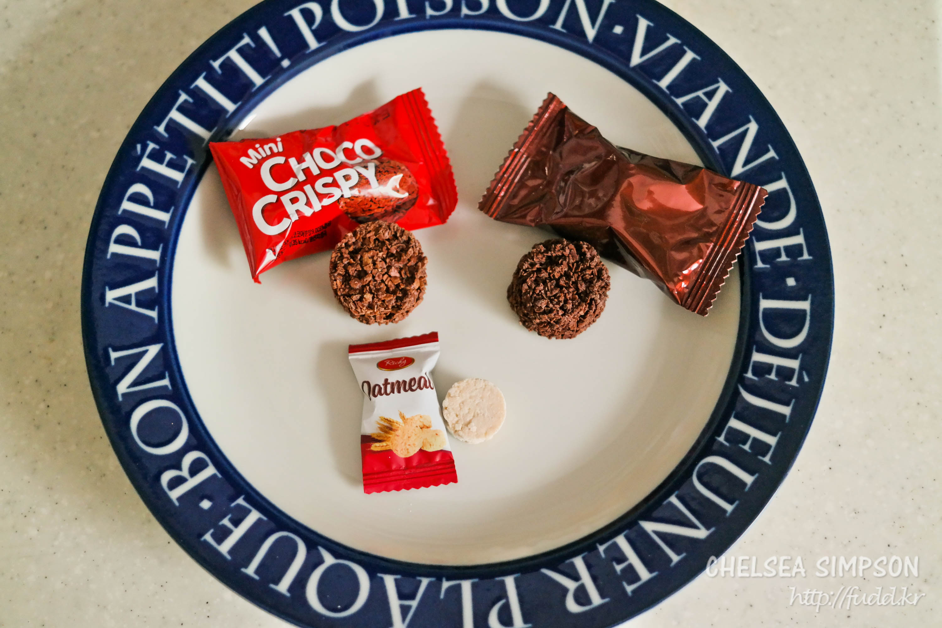 오트밀 시리얼을 생수병 뚜껑만 하게 뭉친 스낵으로 달콤하고 바삭한 초코맛이라 한다.