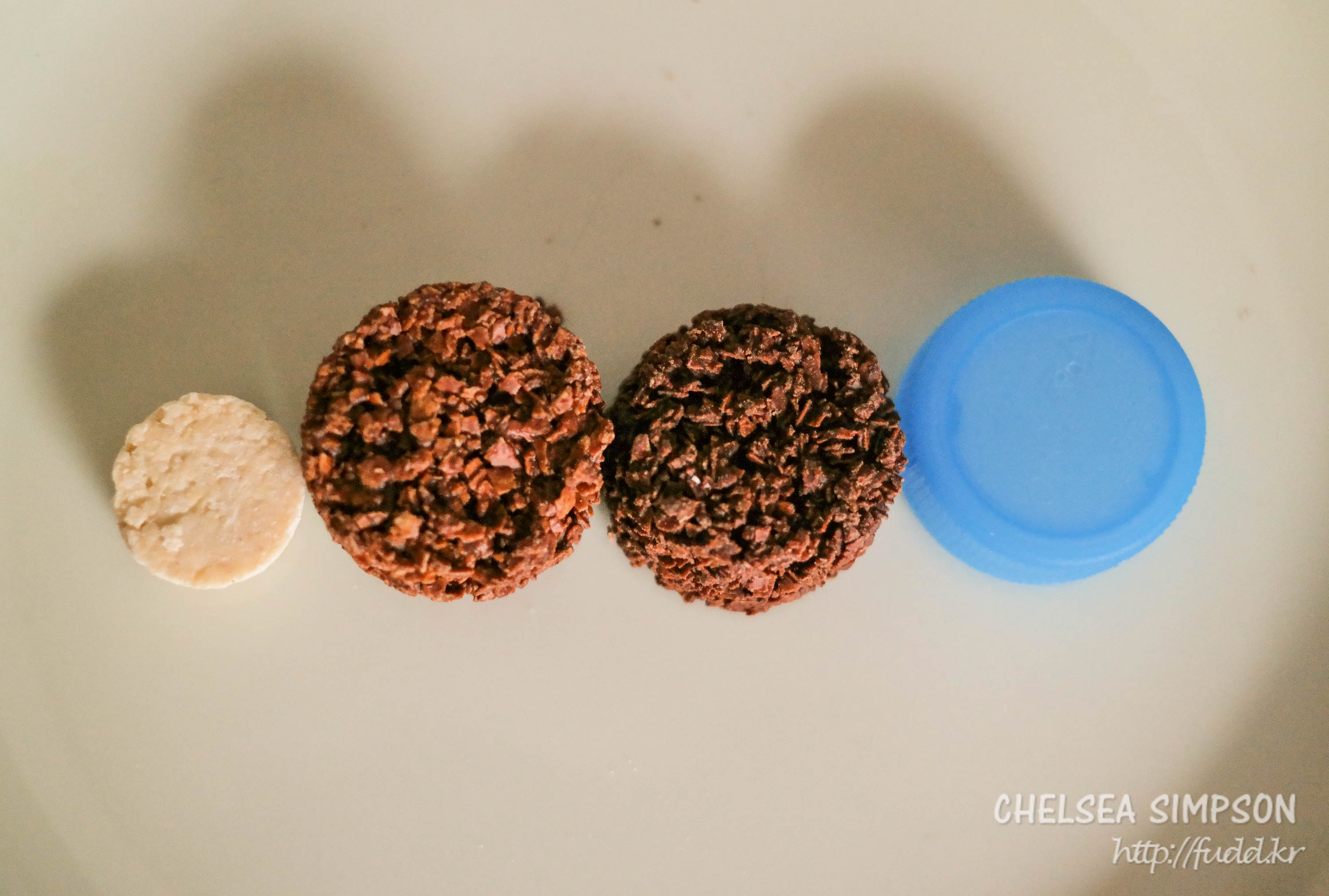 오트밀 시리얼을 생수병 뚜껑만 하게 뭉친 스낵으로 달콤하고 바삭한 다크초코맛이라 한다.