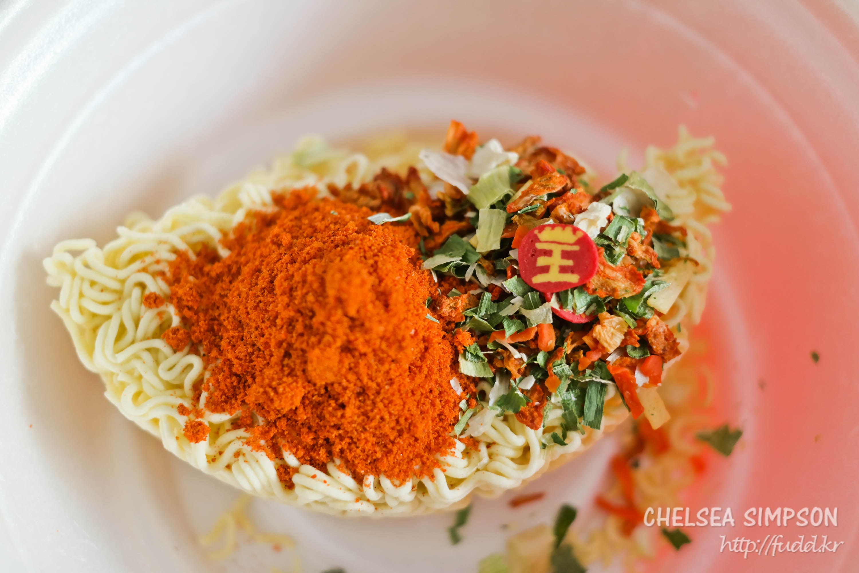 붉은 분말스프 옆에 건조김치후레이크, 당근, 파 등이 들어있다.