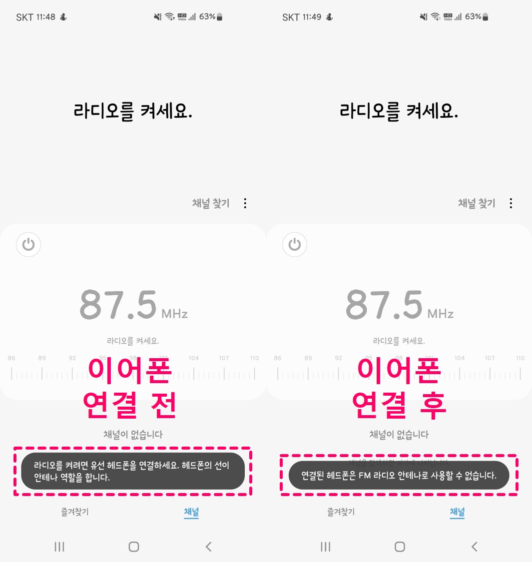 오른쪽처럼 이어폰 연결 후에는 '연결된 헤드폰은 FM 라디오 안테나로 사용할 수 없습니다.'라고 안내된다.