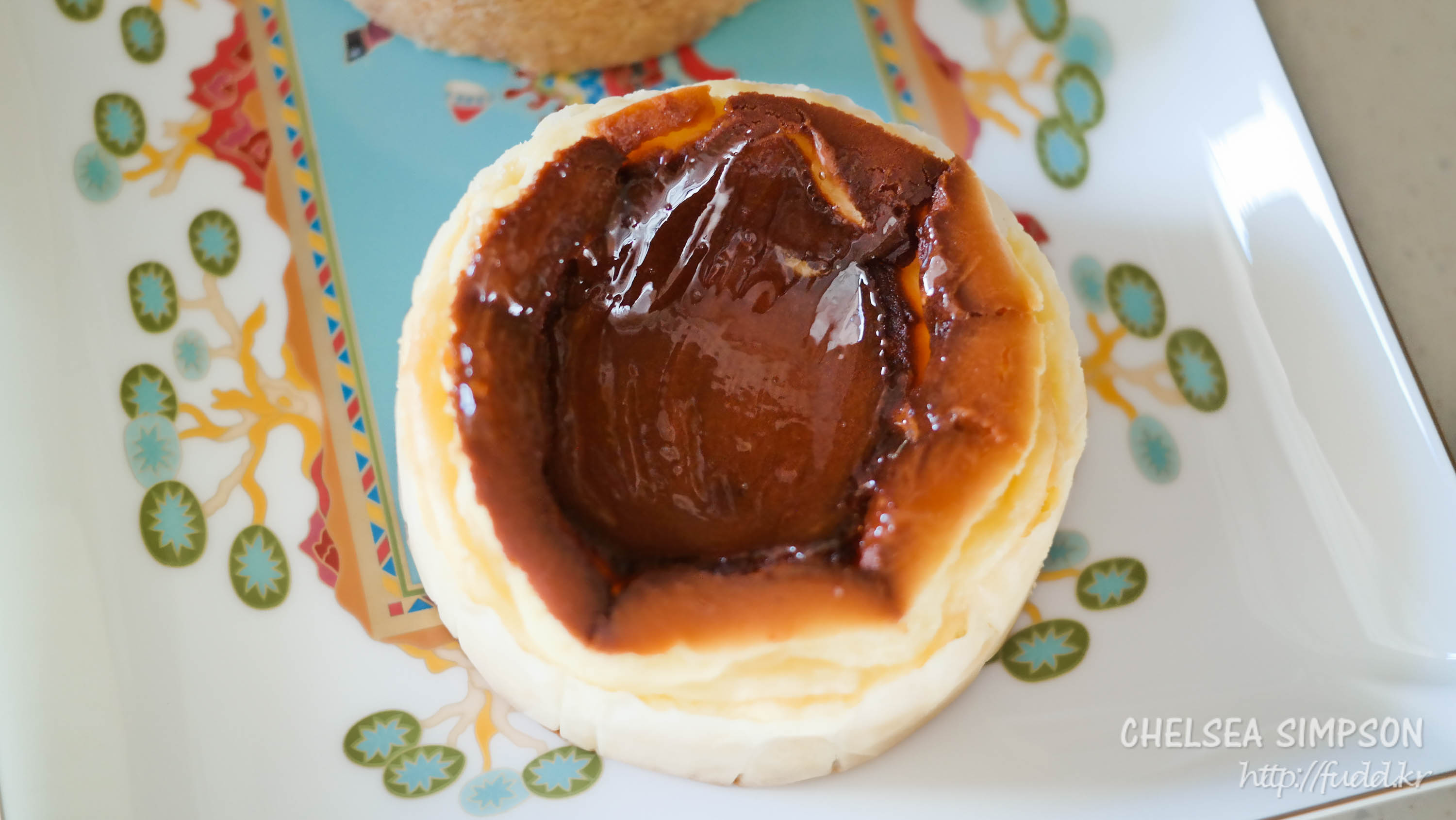 바스크 치즈케이크가 생각나는 형태. 고온으로 구워서 위쪽이 짙은 갈색인 것이 특징이다.