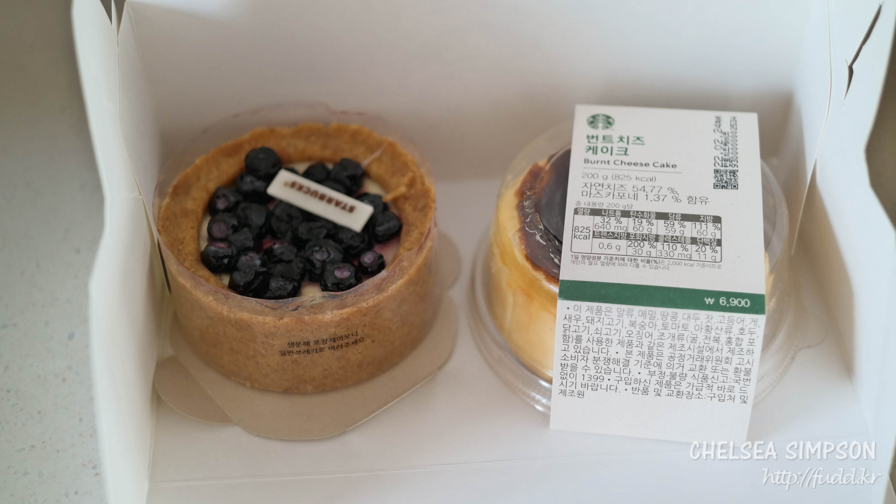 스타벅스의 블루베리 쿠키 치즈케이크(260g, 6,900원)와 번트 치즈케이크(200g, 6,900원).