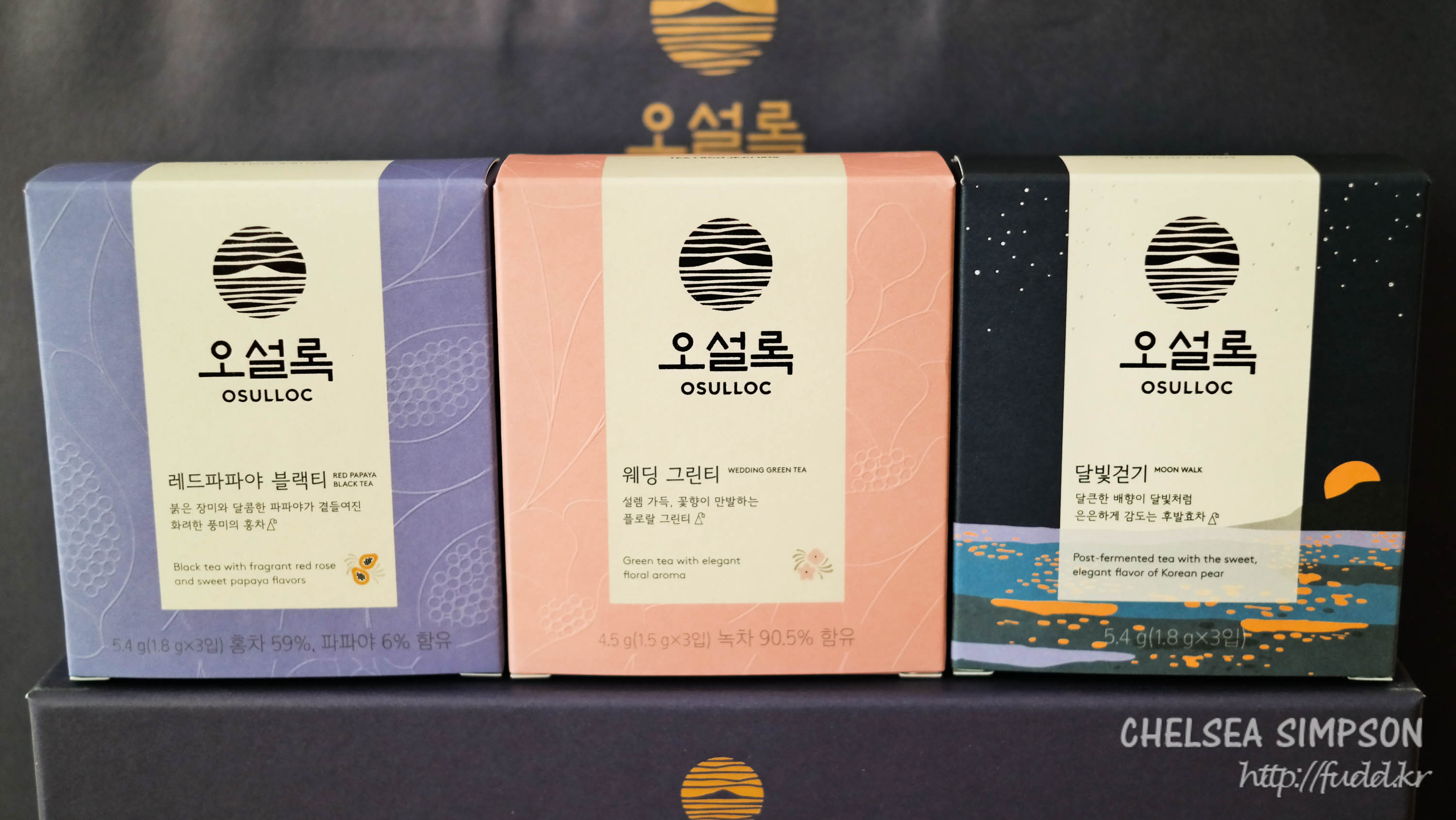 왼쪽부터 레드파파야 블랙티×3입, 웨딩 그린티×3입, 달빛걷기×3입.