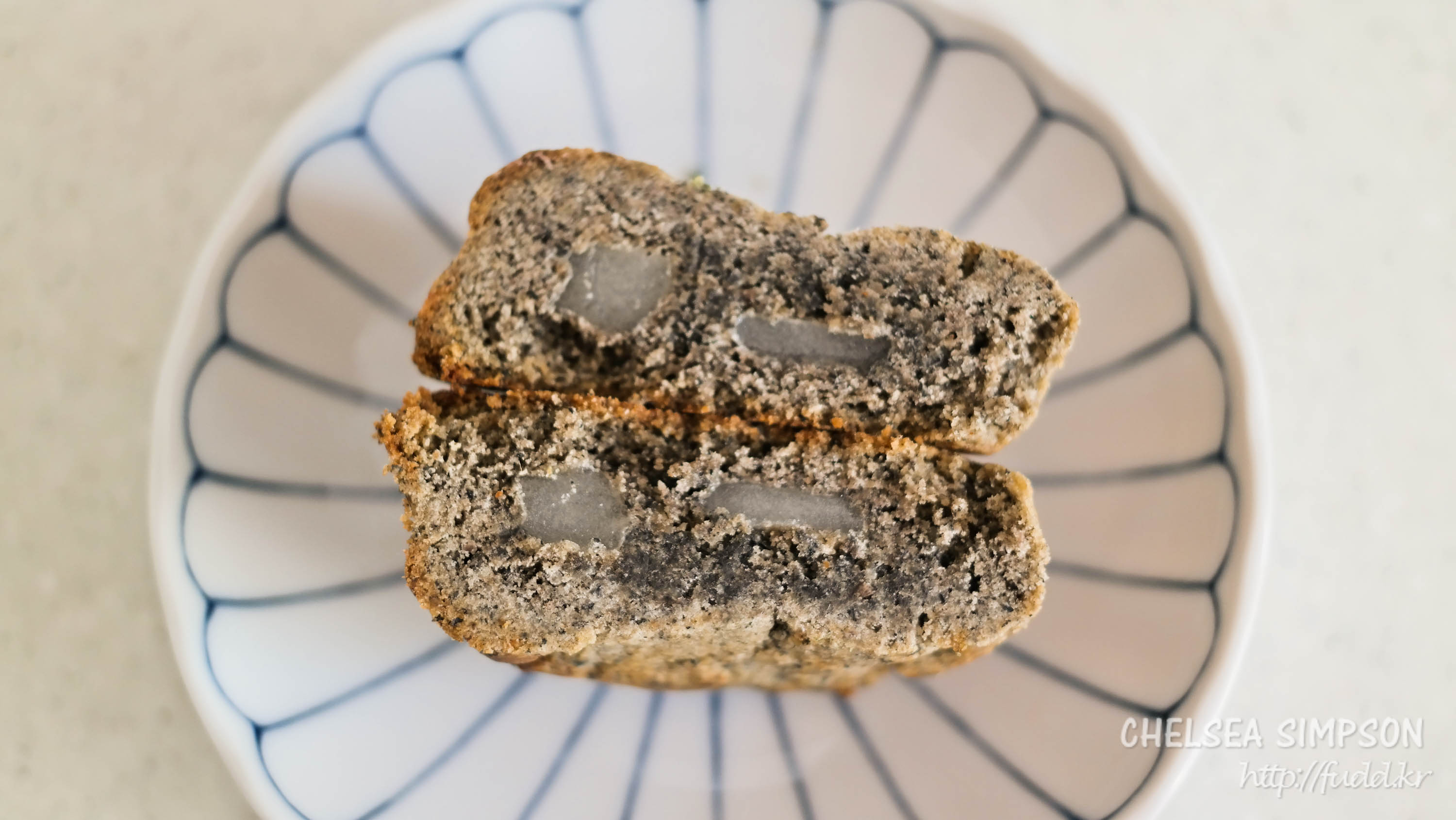 흑임자가 들어있는 쿠키 반죽 속에 말랑한 찰떡이 쏙 박혀 있다.