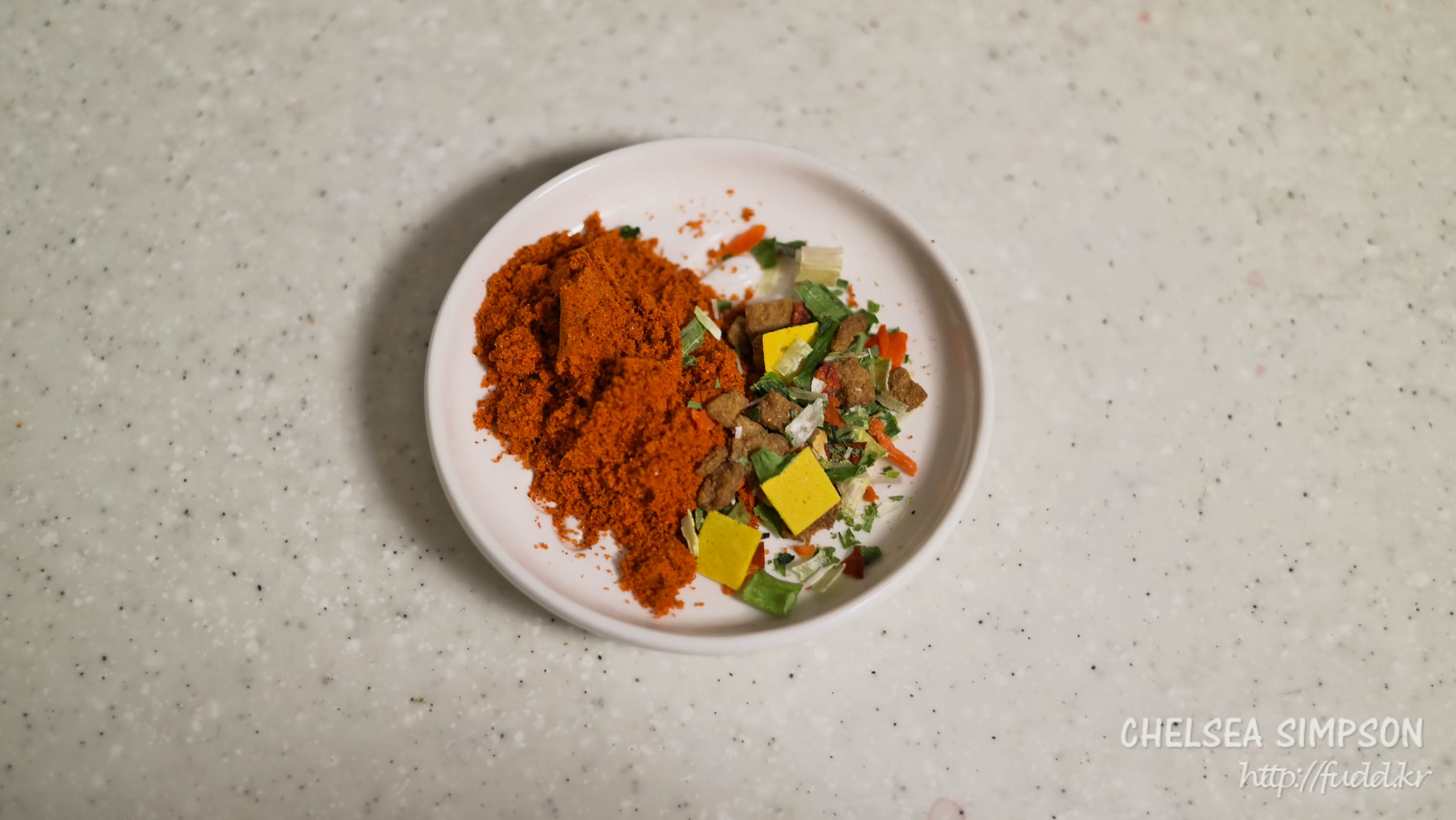 건더기스프는 소고기맛 조미 후레이크와 대파, 당근, 계란 지단 등이 눈에 띈다.