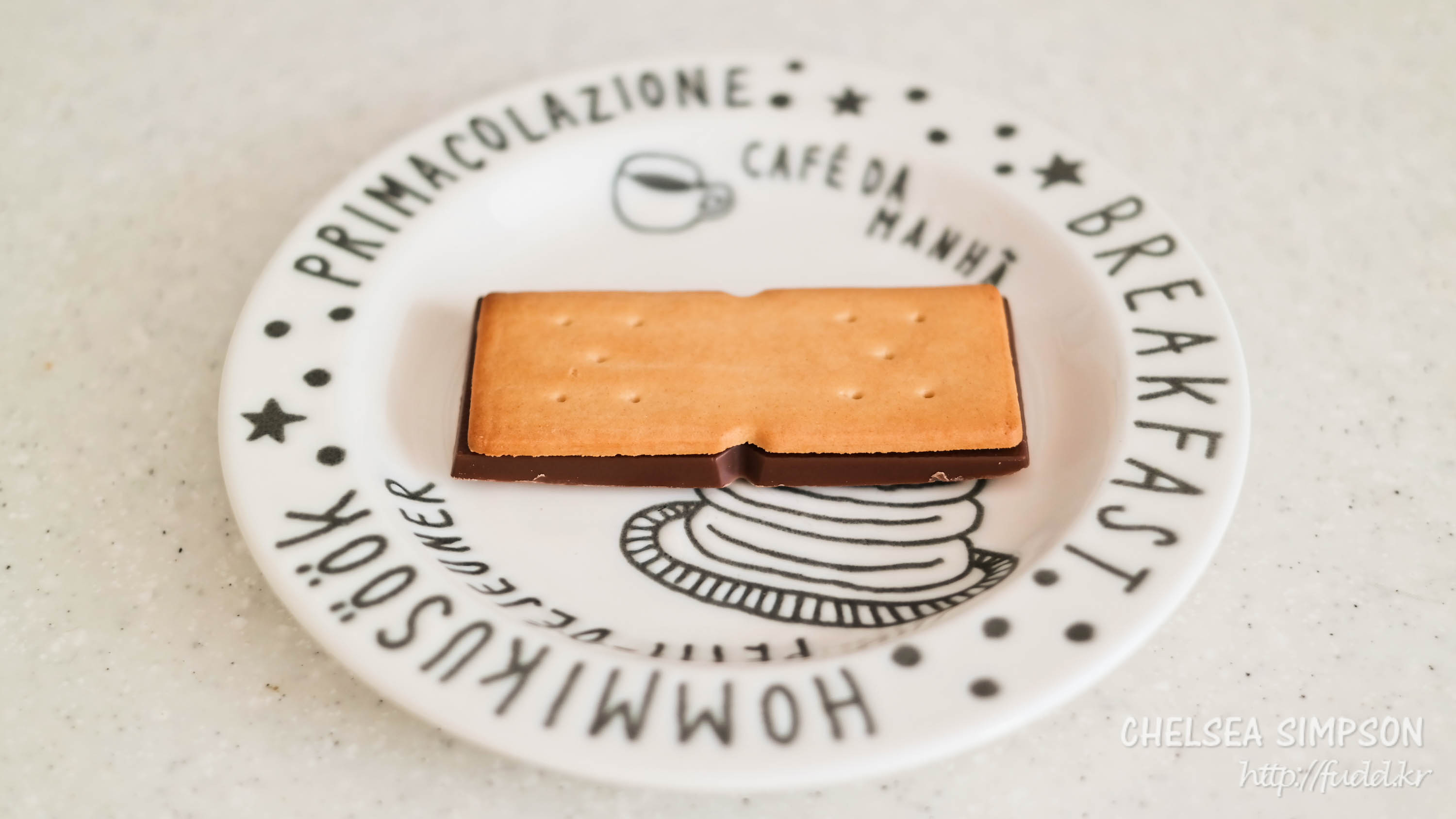 위아래 얇은 비스킷 사이에 두툼한 초콜릿 조각이 들어있다.
