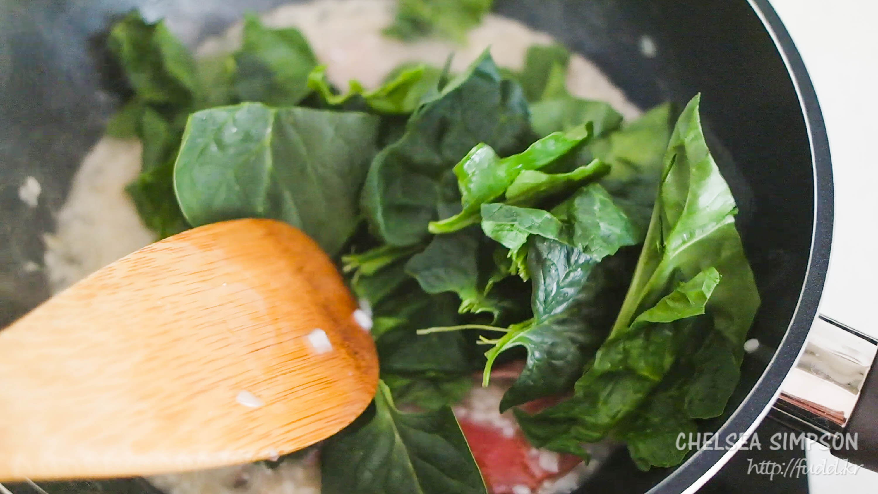 ⑥ Reduce the heat to low, add the spinach leaves and cook for 2 mins, stir occasionally.