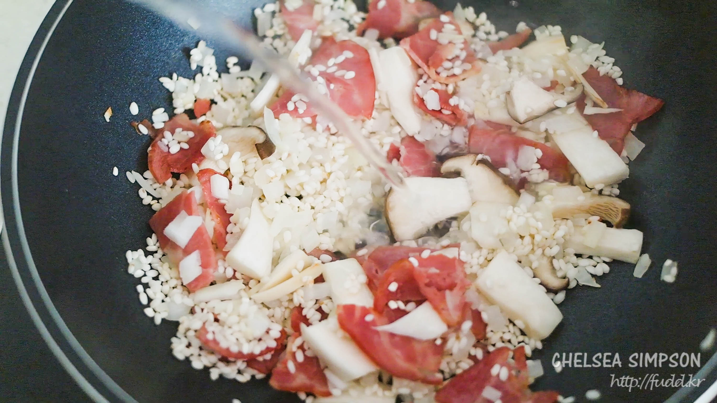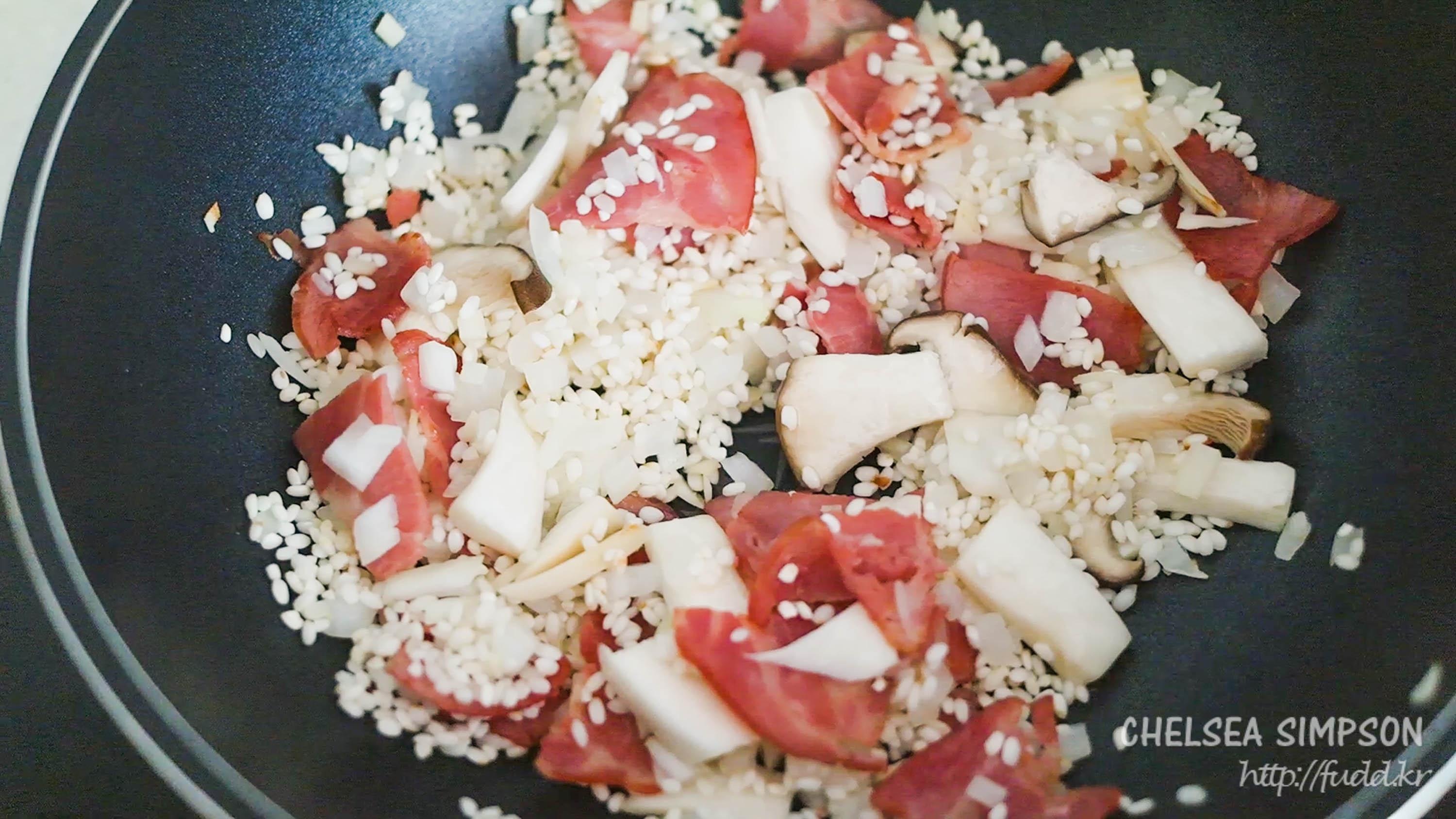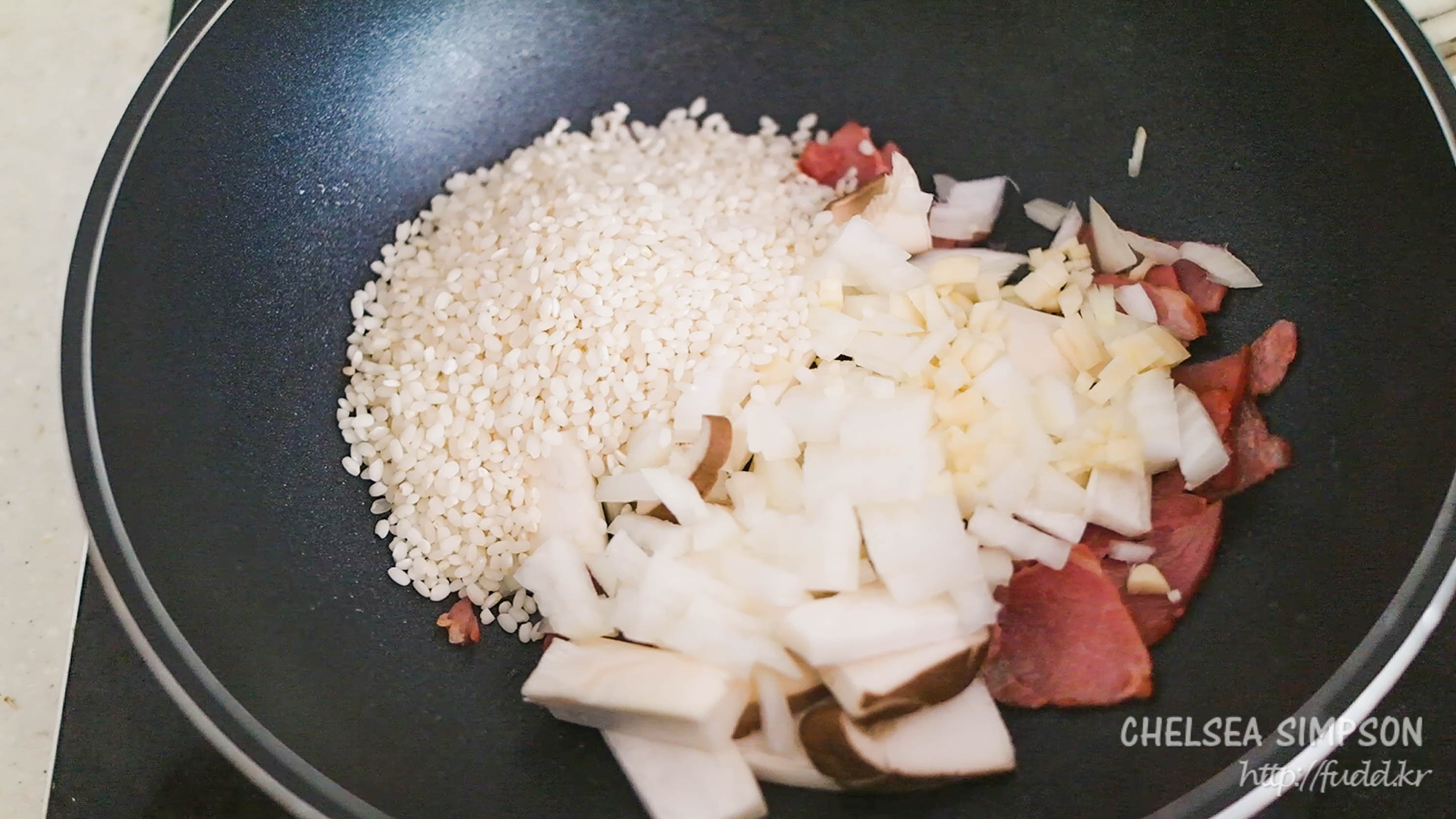팬에 마늘, 양파, 버섯, 쌀을 넣는다.