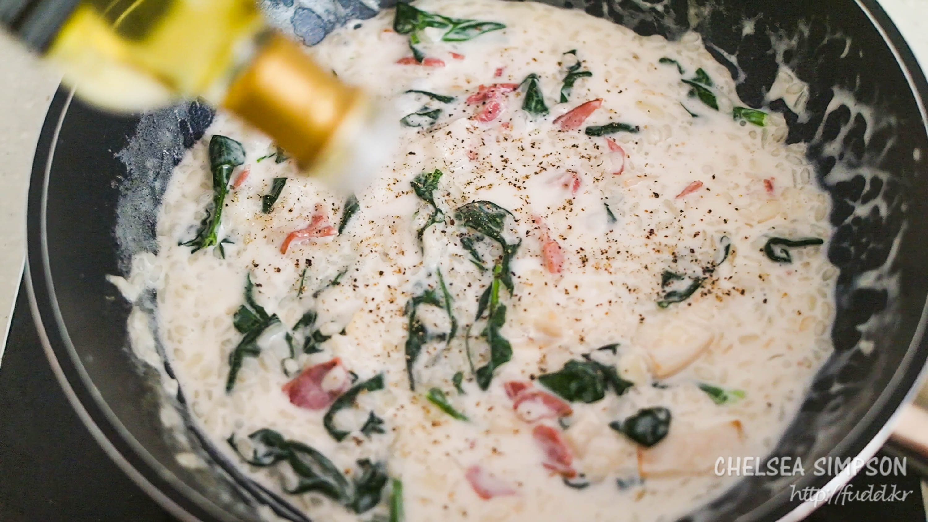 생크림과 치즈를 넣은 뒤 잘 저어가며 2-3분 정도 끓여 쌀을 알 덴테*로 익힌다.