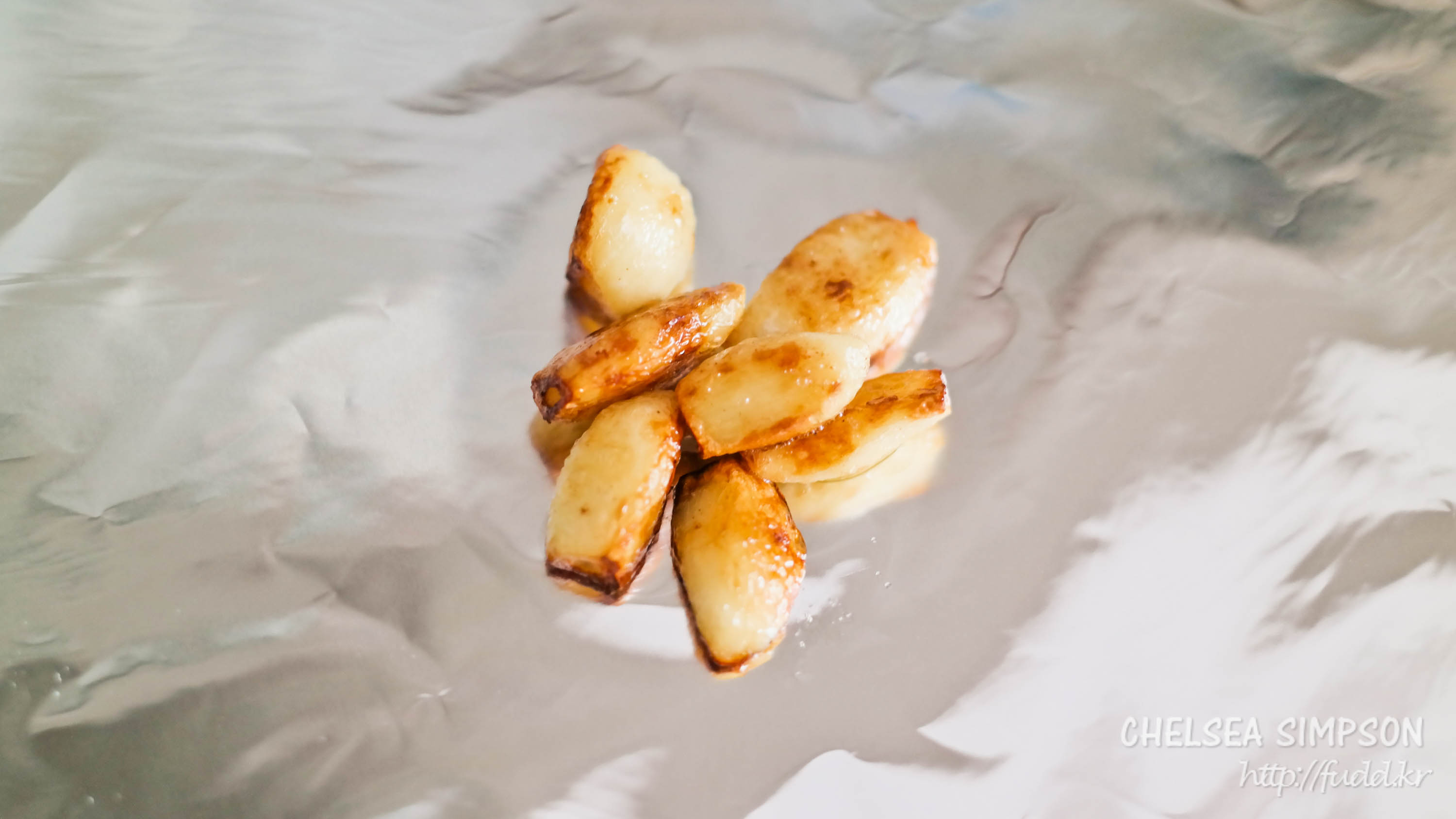 접시 위에 쿠킹 호일을 넓게 펼쳐 깔고 그 위에 구운 마늘을 일단 올려둔다.