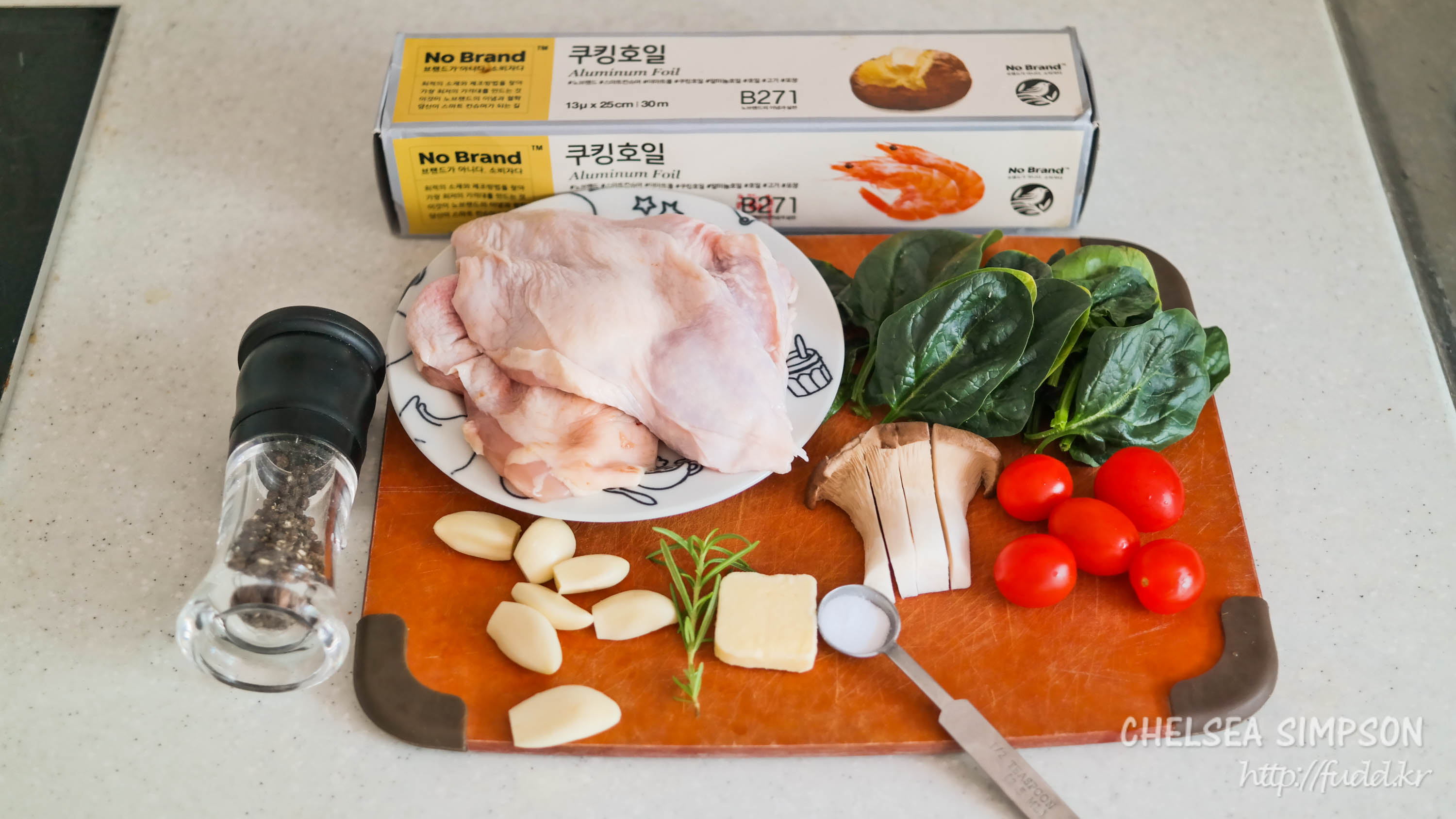 호일은 이따 닭고기 레스팅할 때도 쓸 것이기 때문에 넉넉하게 깔아두는 게 좋다.
