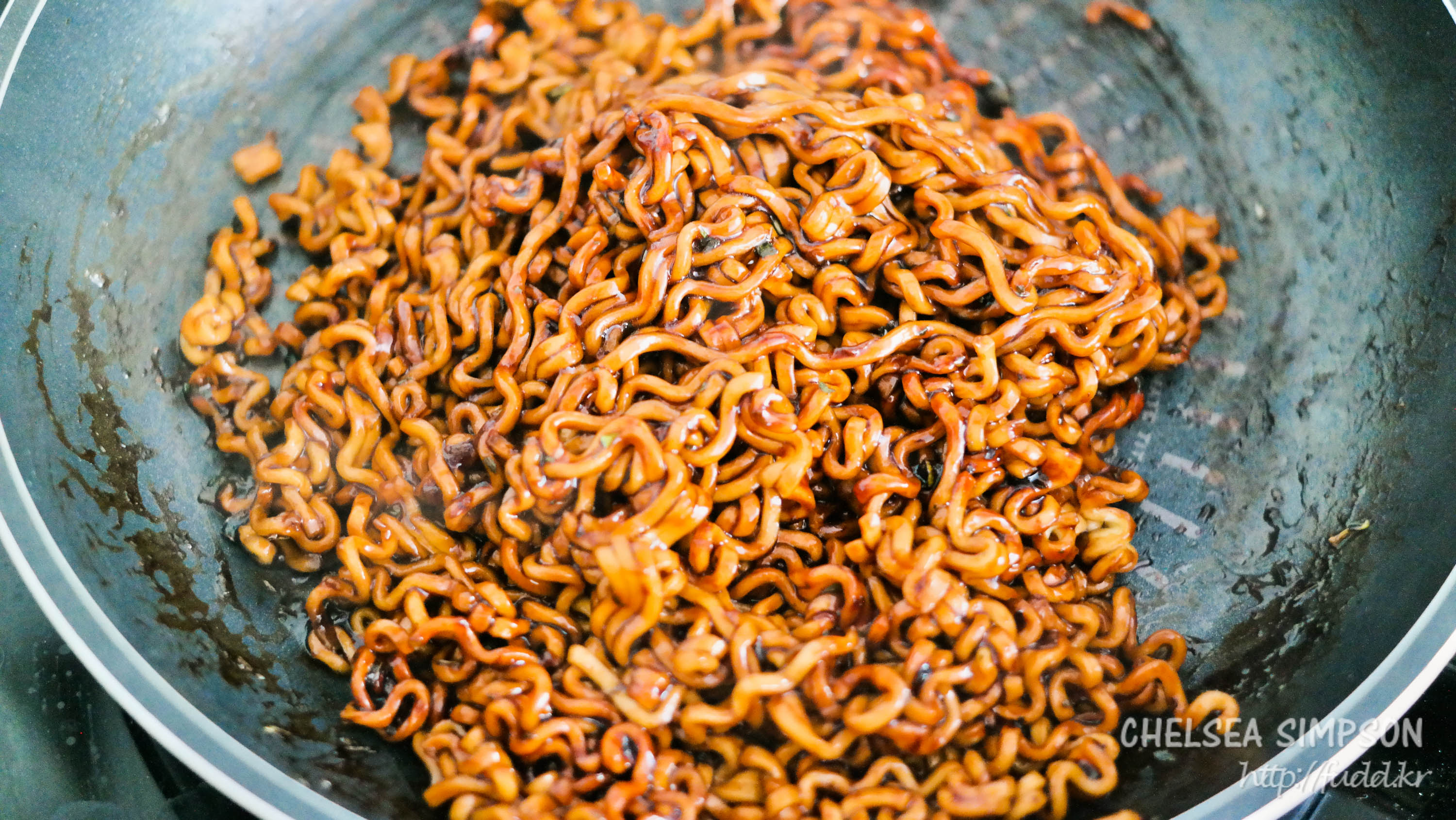 5분 끓인 뒤 물이 거의 잦아들어서 짜장스프를 넣어 재빠르게 비볐다.