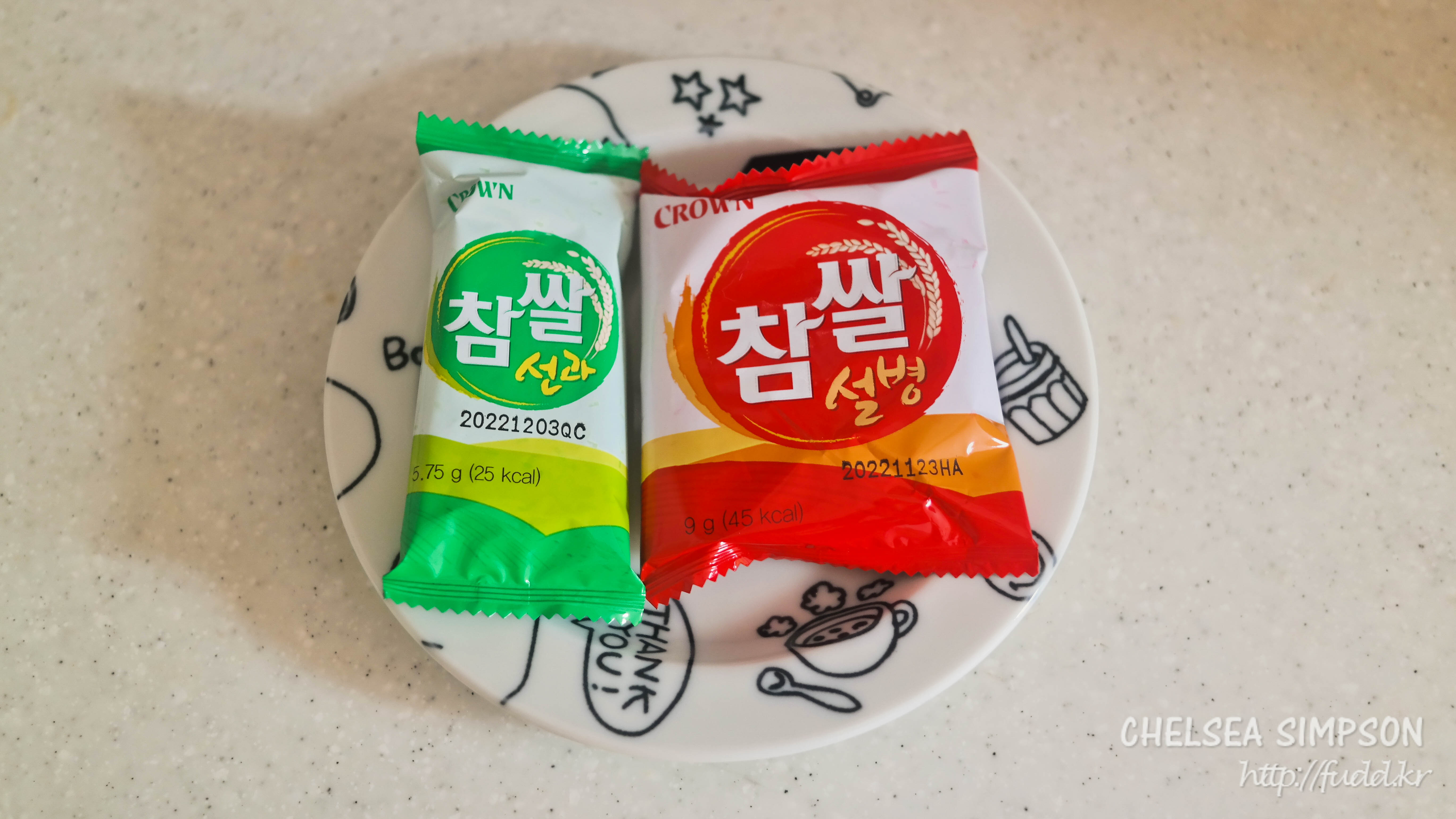 초록색 참쌀 선과는 좀 짭짤하고, 빨간색 참쌀 설병은 약간 달콤하다.