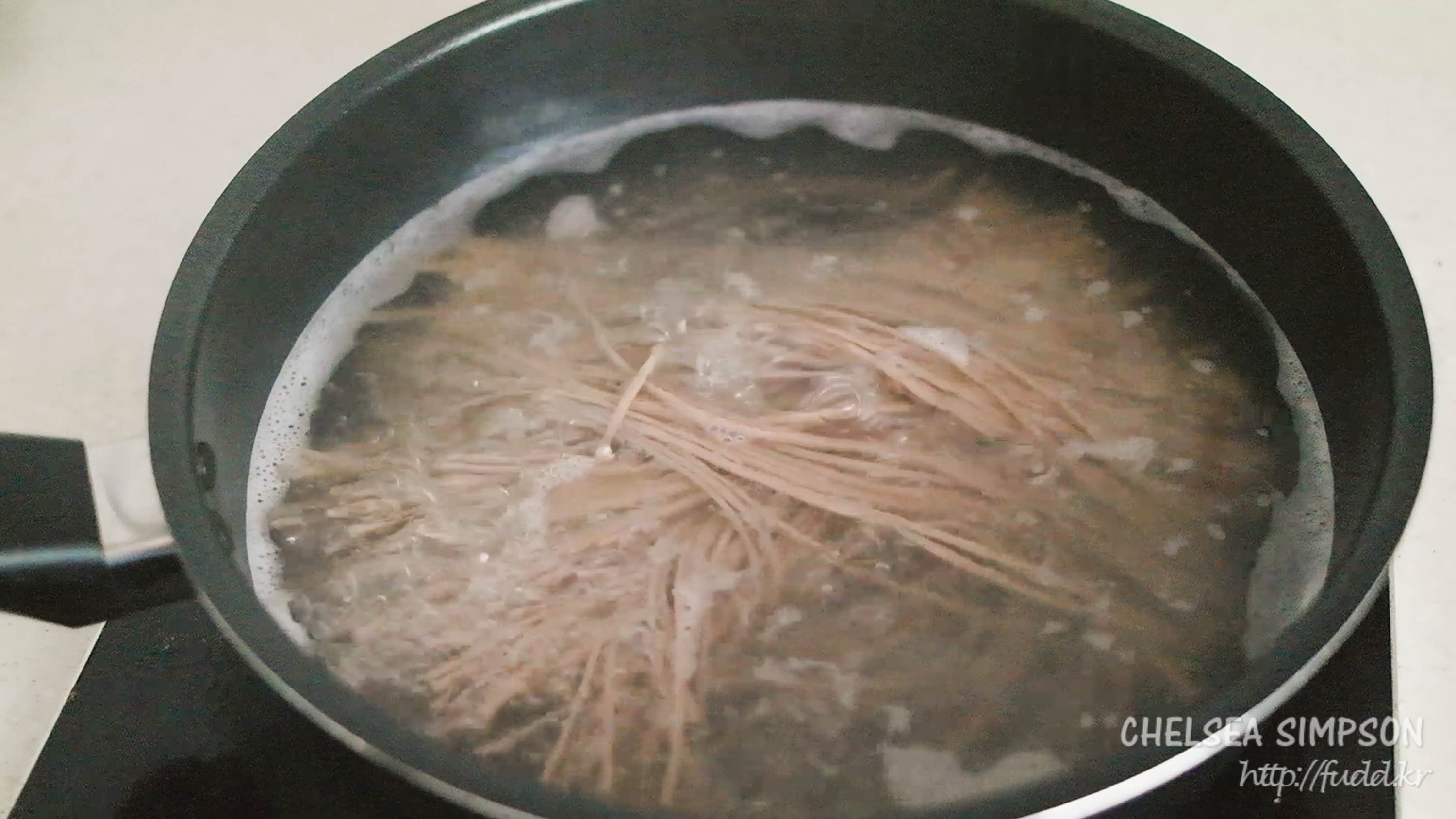 냄비에 물을 끓여 메밀 건면을 넣고 삶는다.