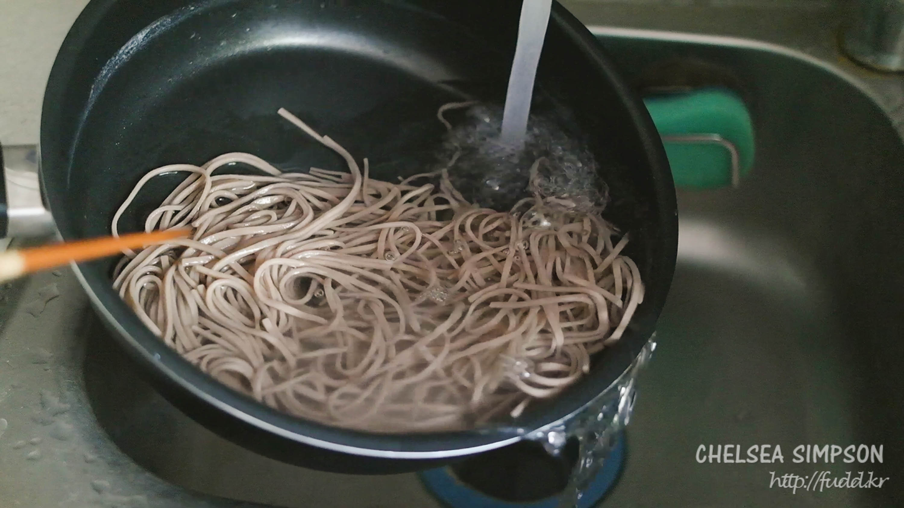 삶은 면을 찬물로 여러 번 헹궈서 식히고 체에 밭쳐 물기를 뺀다.
