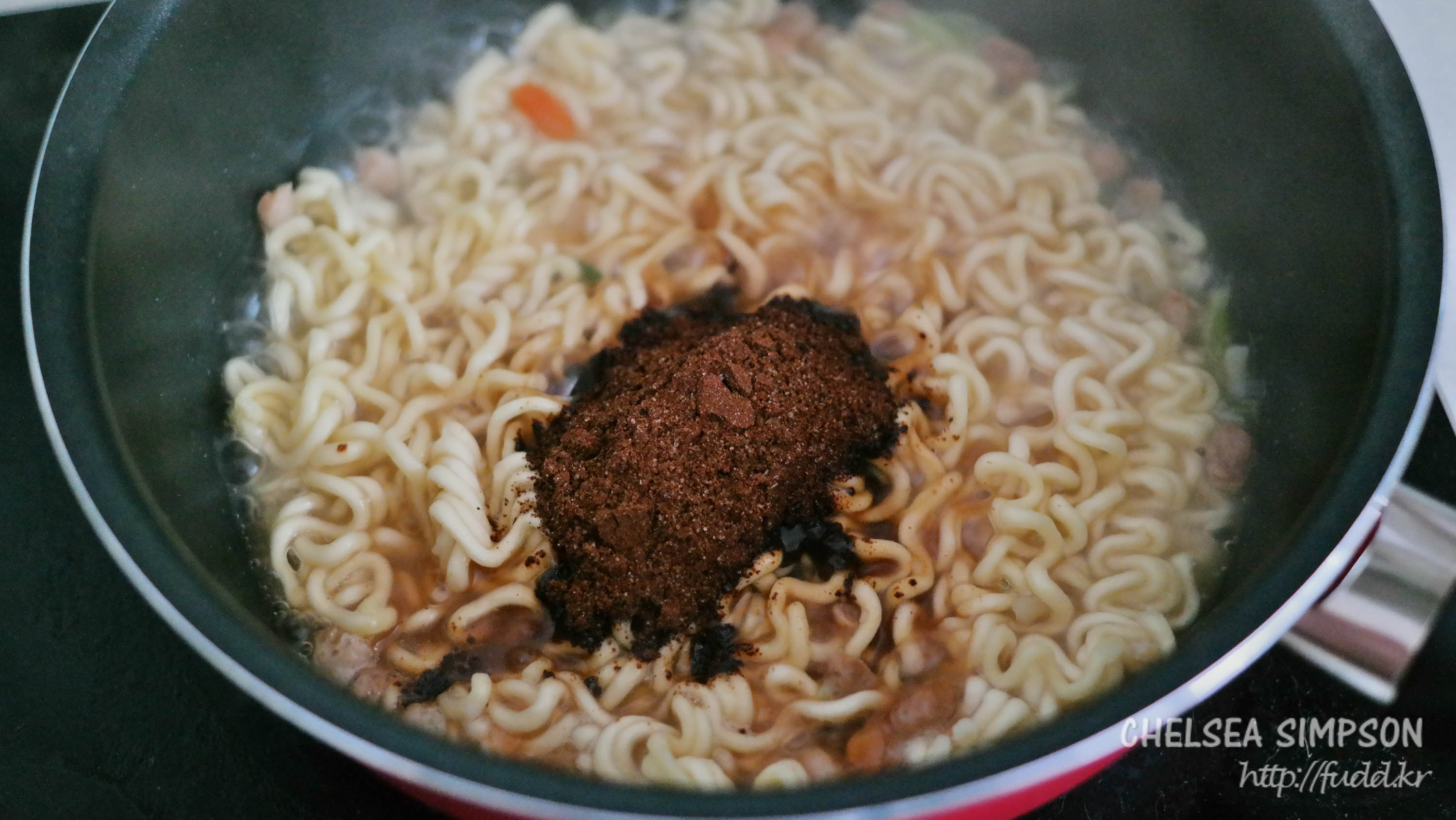 5분 끓인 뒤 불을 끄고 분말스프와 유성스프를 넣었다.