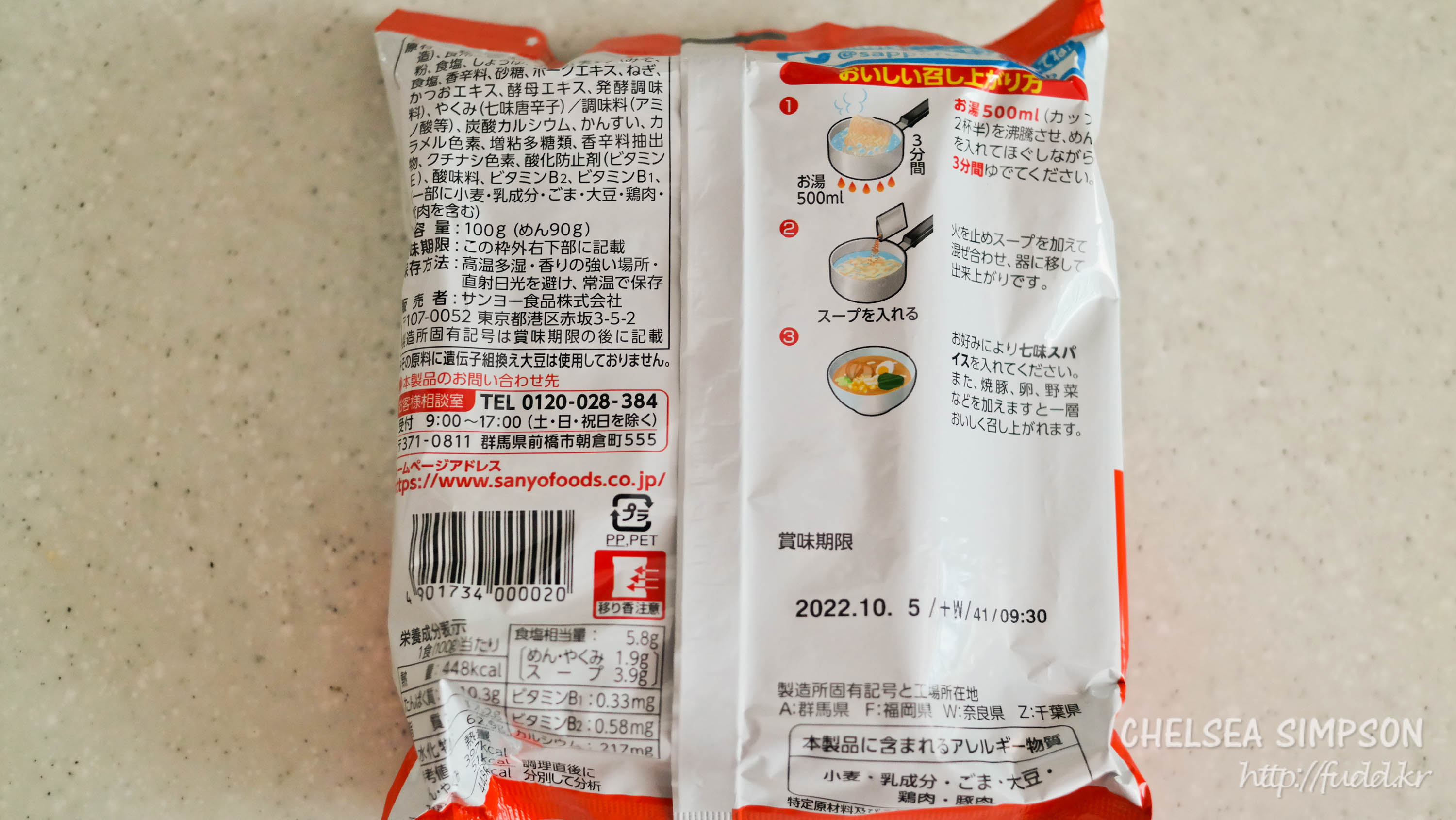 조리법은 물 500ml를 끓이고 면을 넣어 3분 더 조리한 뒤 불을 끄고 분말스프를 섞어서 먹는 것.